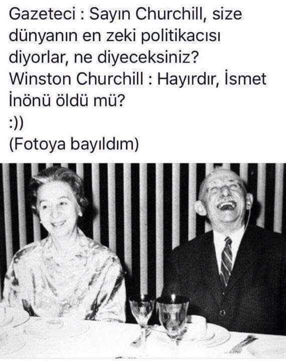 "Bir Basın Mensubu soruyor; – Sayın Churchill size dünyanın en zeki politikacısı diyorlar siz ne diyeceksiniz? Winston Churchill yanıt veriyor; – Hayırdır, İsmet Paşa öldü mü?"