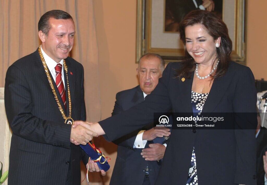 “The Greek mayor of Athens Dora Bakoyannis (R) awards Turkish Prime Minister Recep Tayyip Erdogan (L) the gold medal of merit of the city of Athens during a ceremony in the capital’s city hall on May 7, 2004. Erdogan on Friday started an historic visit to Athens, the first by a Turkish leader in 16 years, and pledged to further improve ties with former rival Greece. REUTERS/John Kolesidis”