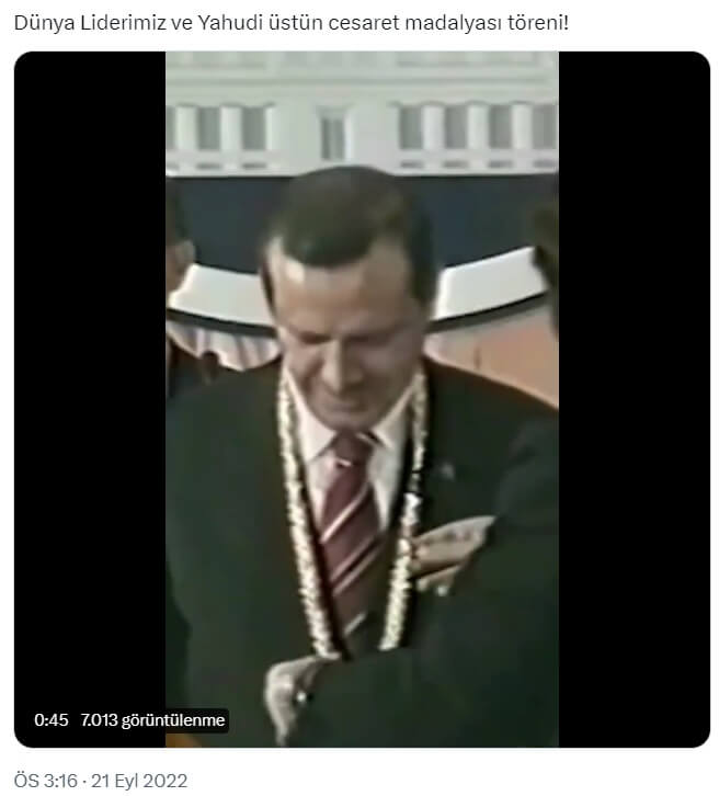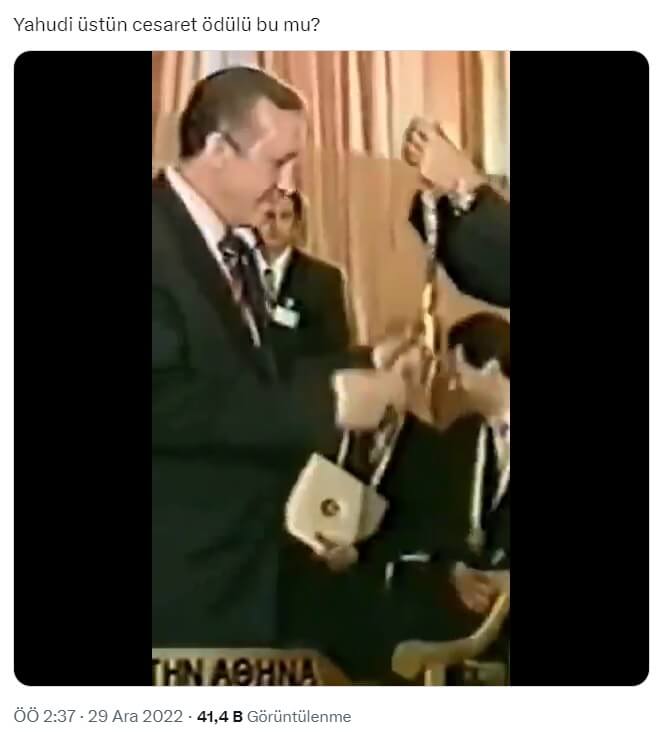 Cumhurbaşkanı Recep Tayyip Erdoğan’ın Yahudi üstün cesaret ödülü aldığı anda kaydedildiği iddiasıyla bir görüntünün sosyal medya platformlarında tekrar dolaşıma girdiği görülüyor.