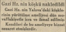 “Bu devirde enteresan bir şey. Atatürk’e yaptığımız bir köşe var. Halen bu köşk ayaktadır ve gayet iyi muhafaza edilmiştir. Köşk için bize verilen direktifte köşkün teras kısmının büyük çınar ağacının gölgesi altında olması emredilmişti. Bunu zamanki su işleri müdürü Ziya Bey ve 1–2 profesörle beraber tespit ettik. Sonra bu kış şeysinde gelip köşkü gördüklerinde katiyen köşkü beğenmediler. Ve dediler ki ‘bu köşk yıkılsın, ben bu köşkü istemiyorum’ dediler. Hâlbuki bina epeyce ortaya çıkmıştı. Atatürk haklıydı. Çünkü Atatürk umumiyetle öğleden sonra çiftliğe gelmeyi tercih ediyorlardı. Ve büyük terasta oturdukları zaman denizi ve doğayı çok sevdikleri için, Yalova’da fevkalade gurub olur. Halbuki bizim koyduğumuz mevkide o büyük çınar ağacının gölgesi tamamen ufuku kapıyordu. Dolayısı ile oradan ne gurup ne deniz görülemeyecekti. ‘Yıkın bunu’ dediler. Epey masraf külfet de olmuştu. Yalnız üniversite profesörlerinden Sadi Bey ve İhsan Bey vardı arkadaşlar. Onlar da dedi ki fikir olarak hocam dediler müsaade buyrun yıkmayalım bu binayı nakledelim dediler. E nasıl olur? Olur yaparız hesap ederiz bunu dediler statik hesaplarını yaparız ve naklederiz dediler. Atatürk bunu gayet orijinal buldu. ‘O halde nakledin bakalım’ dedi. Ve aşağı yukarı 5 – 5,5 aylık bir mesaiden sonra alınan tertibatla bu köşk evvela terası ki 28 ton ağırlığındaydı, betonarmeydi o. Arkasından da köşk ki 2 katlıdır o taşındı. Ve bunu merakla gelip saatlerce orda köşkün bu şekilde taşınmasını seyrettiler ve beğendiler. Köşk hakikaten gayet hesaplı bir şekilde nakledildi. Yani bundan dolayı üniversite profesörlerimizi iyi anmak lazım hala hayatta değiller çünkü yapılan hesap ve kitaplar o kadar isabetli oldu ki bugün 50 seneye yaklaştığı halde bu köşk 1 santim dahi [] oturmamıştır… Yalnız kışın şimal rüzgârlarından müteessir oluyor; çünkü büyük dalgalar tuzlu rüzgarları şeye çarpıyor o yüzden her vakit bir boyama ve tamir şeysine muhtaç kalıyor.”
