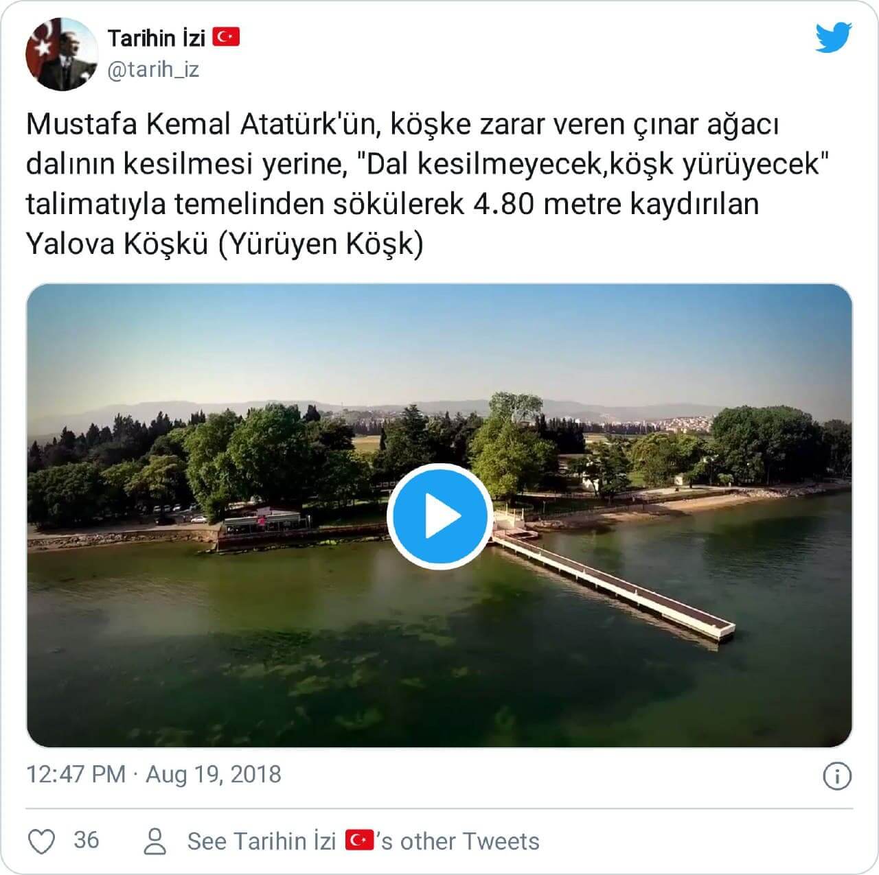 - Mustafa Kemal Atatürk’ün, köşke zarar veren çınar ağacı dalının kesilmesi yerine, “dal kesilmeyecek, köşk yürüyecek” talimatı