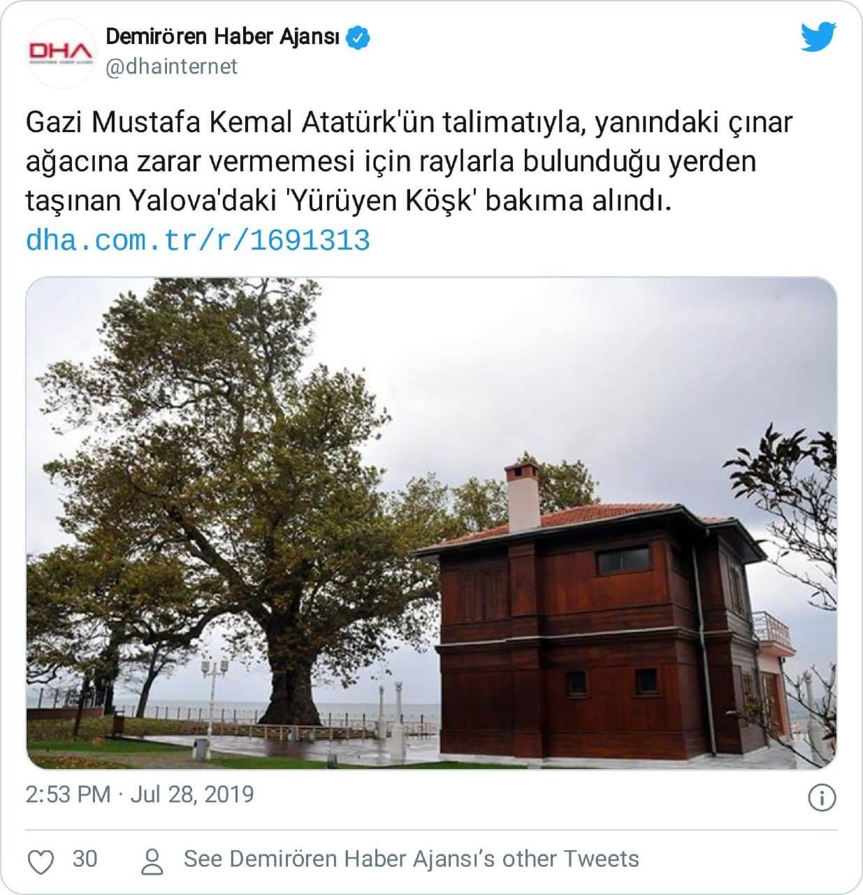 Açıkça “köşk için ağaç kesilmemiş köşk yürütülmüş” ve bu Atatürk’ ün isteği ya da onayıyla olmuş, dolayısıyla “ Bir Çınar Ağacı Dalının Kesilmemesi İçin Yalova’daki Yürüyen Köşk’ün Taşınmasına Karar Verildiği İddiası ” Doğru olmuş oluyor !