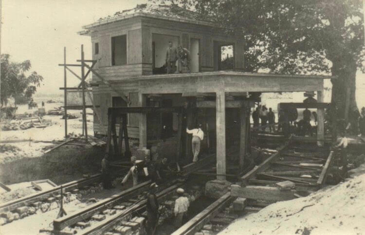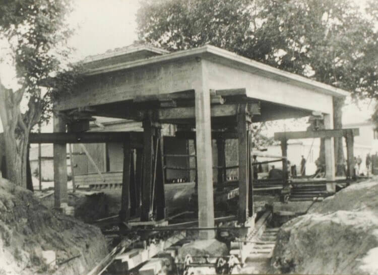 Santim santim çalışılarak bina yapı altına sokulan raylar üzerine oturtulur. Artık binanın raylar üzerinde kaydırılarak ağaçtan uzaklaştırılması aşamasına gelinmiştir.