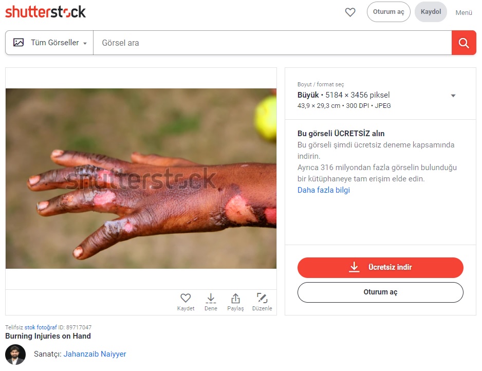 Türkiye’de yangınlara müdahale ederken yaralanan 19 yaşındaki genç vatandaşın eline ait olduğu iddiasıyla paylaşılan fotoğraf aslında Shutterstock’ta satışta bulunan bir stok görsel.