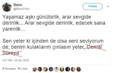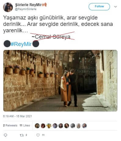 Ancak hâlâ bahse konu dizeler Cemal Süreya’ya ait olduğu iddiasıyla paylaşılabiliyor…