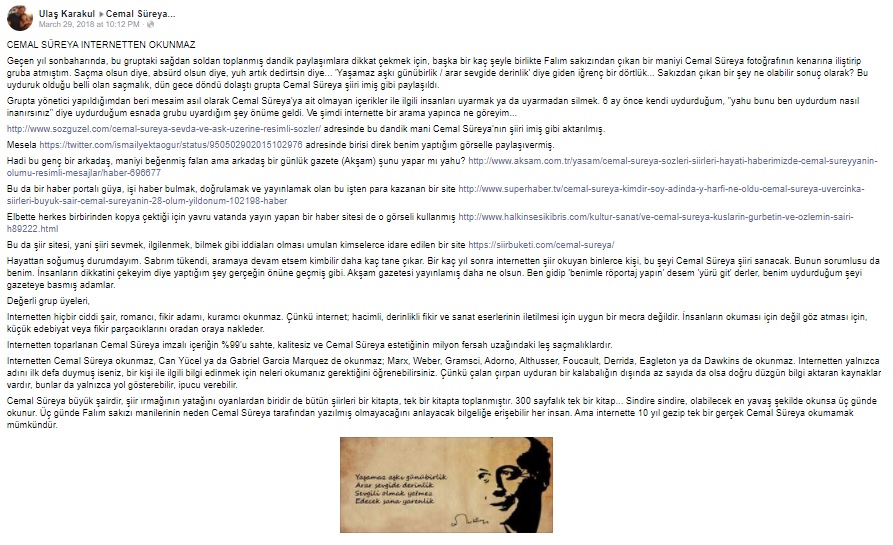 İşim gücüm olmadığı için, Cemal Süreya adına açılmış bir facebook grubunda Cemal Süreya’ya ait olmayan çer çöp şiir ya da yazıların, Cemal Süreya imzası ile yayınlanması nedeniyle paylaşımların altında uyarılar yapıyordum, ‘Cemal Süreya’ya ait değil’ diye.
