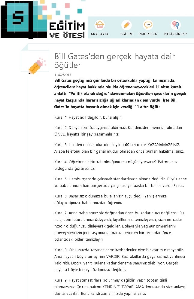 Egitimveotesi.com‘da yayınlanan “Bill Gates’ten Gerçek Hayata Dair Öğütler” başlıklı aslında Bill Gates’e ait olmayan öğütler