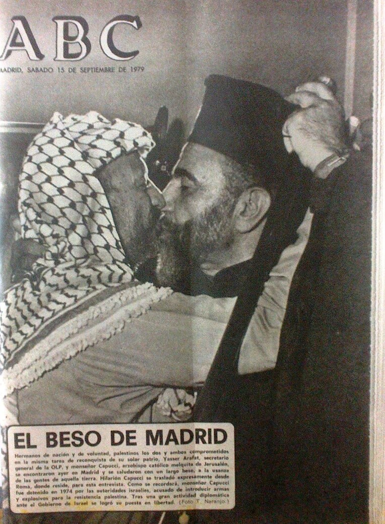 Yaser Arafat’la Hilarion Capucci’nin öpüşerek selamlaştığı görülen fotoğraf 15 Eylül 1979 tarihinde Madrid’de kaydedilmiş.
