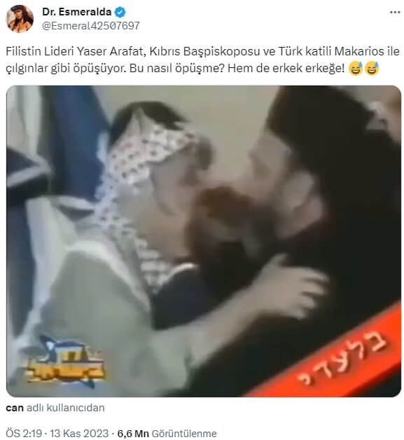 Dr. Esmeralda (@Esmeral42507697): “Filistin Lideri Yaser Arafat, Kıbrıs Başpiskoposu ve Türk katili Makarios ile çılgınlar gibi öpüşüyor. Bu nasıl öpüşme? Hem de erkek erkeğe! “