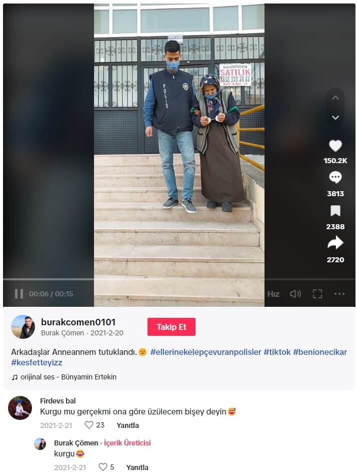 Bahsi geçen video 20 Şubat 2021 tarihinde TikTok’ta “Arkadaşlar Anneannem tutuklandı. #ellerinekelepçevuranpolisler #tiktok #benionecikar #kesfetteyizz” açıklamasıyla paylaşılmış.