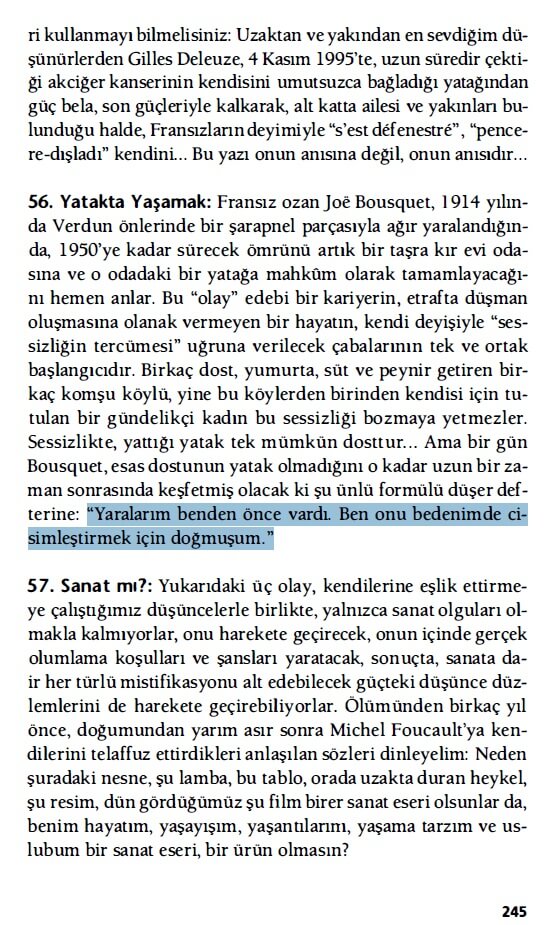 “56. Yatakta Yaşamak: Fransız ozan joe Bousquet, 1914 yılında Verdun önlerinde bir şarapnel parçasıyla ağır yaralandığında, 1950’ye kadar sürecek ömrünü artık bir taşra kır evi odasına ve o odadaki bir yatağa mahkum olarak tamamlayacağını hemen anlar. Bu “olay” edebi bir kariyerin, etrafta düşman oluşmasına olanak vermeyen bir hayatın, kendi deyişiyle “sessizliğin tercümesi” uğruna verilecek çabalarının tek ve ortak başlangıcıdır. Birkaç dost, yumurta, süt ve peynir getiren birkaç komşu köylü, yine bu köylerden birinden kendisi için tutulan bir gündelikçi kadın bu sessizliği bozmaya yetmezler. Sessizlikte, yattığı yatak tek mümkün dosttur . . . Ama bir gün Bousquet, esas dostunun yatak olmadığını o kadar uzun bir zaman sonrasında keşfetmiş olacak ki şu ünlü formülü düşer defterine: “Yaralarım benden önce vardı. Ben onu bedenimde cisimleştirmek için doğmuşum.””