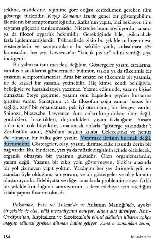 “Bu yalnızca tanı meselesi değildir. Göstergeler yaşam tarzlarına, varoluş olanaklarına göndermede bulunur, taşkın ya da tükenmiş bir yaşamın semptomlarıdırlar. Ama bir sanatçı ne tükenmiş bir yaşamla, ne de kişisel bir yaşamla yetinebilir. Hiç kimse kendi benliğiyle, belleğiyle ve hastalıklarıyla yazamaz. Yazma ediminde, yaşamı kişisel olmaktan öteye geçirme, yaşamı onu hapseden şeyden kurtarma girişimi vardır. Sanatçının ya da filozofun çoğu zaman hassas bir sağlığı, zayıf bir organizması, pek iyi oturmamış bir dengesi vardır, Spinoza, Nietzsche, Lawrence. Ama onları kırıp döken ölüm değil, gördükleri, hissettikleri, düşündükleri yaşam fazlalığıdır. Yaşamonlar için çok büyüktür, ama ancak onlarla “gösterge yakındadır”: Zerdüşt’ün sonu, Etika’nın beşinci kitabı. Gelecekteki ve henüzdili olmayan bir halka göre yazılır. Yaratmak iletişim kurmak değil, direnmektir. Göstergeler, olay, yaşam, dirimselcilik arasında derin birbağ vardır. Bu, bir desen, yazı ya da müzik çizgisinin içinde olabilecek, organik olmayan bir yaşamın gücüdür. Ölen organizmalardır, yaşam değil. Yaşama bir çıkış yolu göstermeyen, bloklar arasında bir yol çizmeyen yapıt yoktur. Yazdığım her şey dirimselciydi, enazından öyle olduğunu sanıyorum, ve bir göstergeler ve olay kuramı oluşturuyordu. Edebiyatta ve diğer sanatlarda problemin ortaya farklı bir şekilde konduğunu sanmıyorum, sadece edebiyat için istediğim kitabı yapma firsatım olmadı.”
