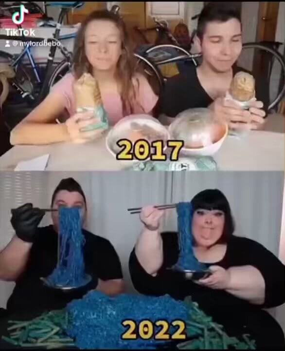 Fast-food odaklı yiyecekleri tükettikleri görüntülerini sosyal medya platformlarında yayınlayan çiftin yıllar içindeki değişimini yansıttığı iddiasıyla paylaşılan video şu şekilde: