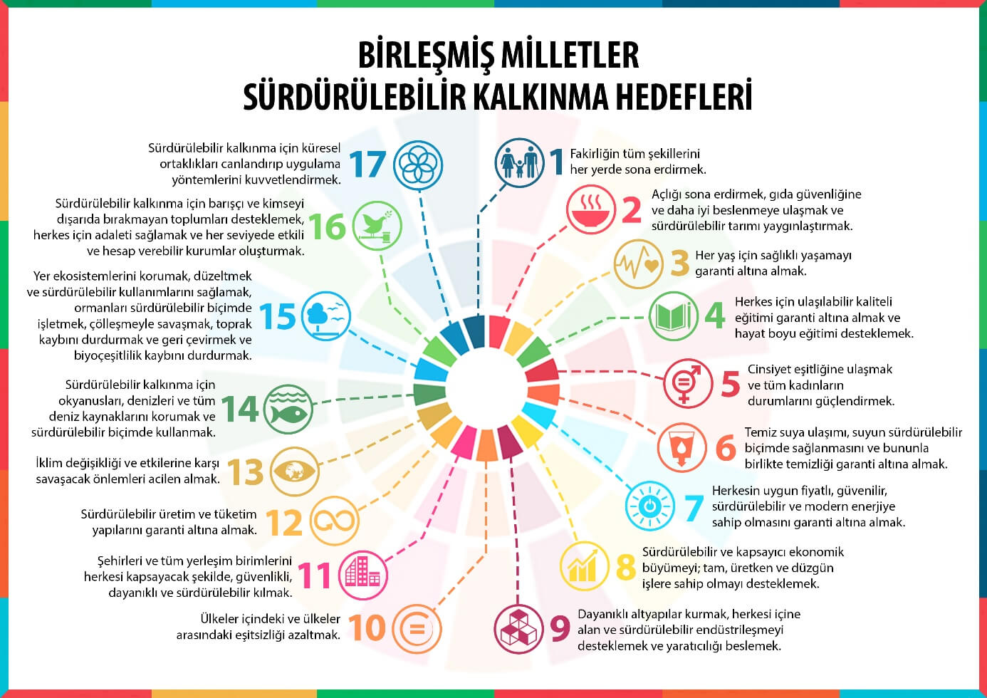 BM’nin Sürdürülebilir Kalkınma için 2030 hedefleri, yoksulluğun son erdirilmesi, çevrenin korunması, iklim krizine karşı önlem alınması, refahın adil paylaşımı ve barış odaklı 17 ana başlığı içeriyor.