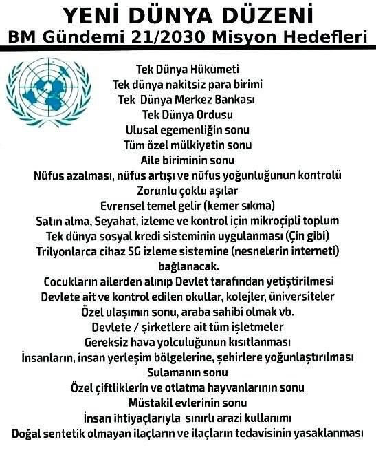 “Yeni Dünya Düzeni BM Gündemi 21/2030 Misyon Hedefleri” başlığıyla paylaşılan (BM ile bir ilgisi bulunmayan) liste şu şekilde: