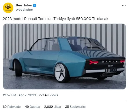 Araba İnceleme, Bee Haber, Zam Haber, Farklı Gerçekler, Medyanın 51 Tonu gibi sosyal medya profilleri bahsi geçen görselleri “2023 model Renault Toros yollara çıkıyor! Türkiye fiyatının 850 bin TL olması bekleniyor.” notuyla paylaşmış.