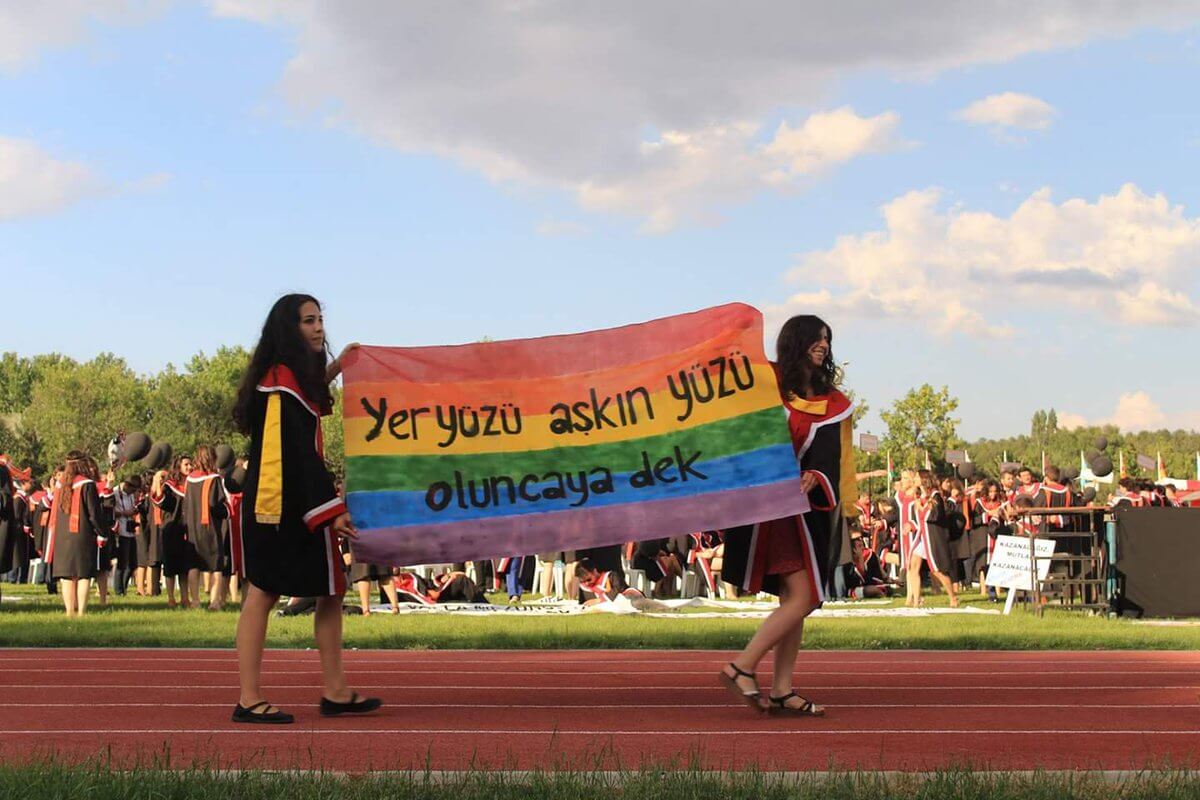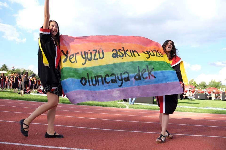 ODTÜ’de 2016 yılında düzenlenen mezuniyet töreninde açılan, gökkuşağı üzerine “yeryüzü aşkın yüzü oluncaya dek” mısrasının yazılı olduğu pankartın bu iddiayla birlikte paylaşıldığı görülüyor.