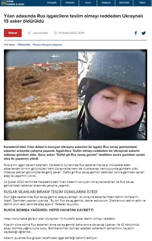 Rusya’nın Ukrayna’yı işgal harekâtına başlamasının ardından 24 Şubat 2022 günü Karadeniz’deki 42 dönümlük Yılan Adası‘na (Serpent Adası – Zmiini / Snake Island) yapılan saldırıda 13 sınır muhafızının yaşamını yitirdiği iddiası Ukraynalı yetkililerce dile getirilmesinin ardından basında ve sosyal medyada yaygın şekilde paylaşılmıştı.
