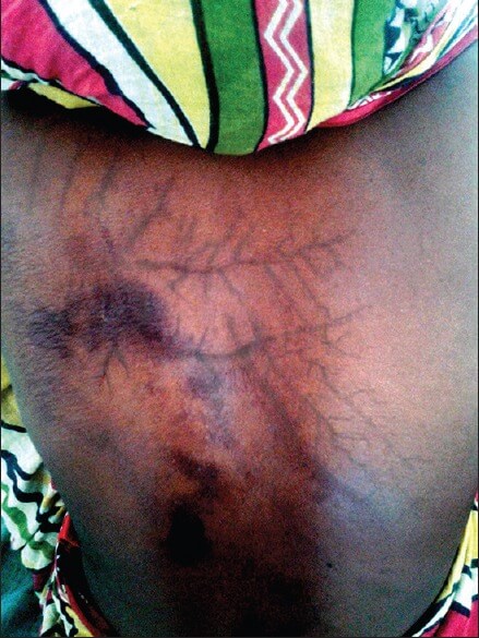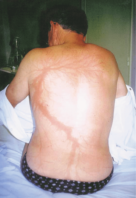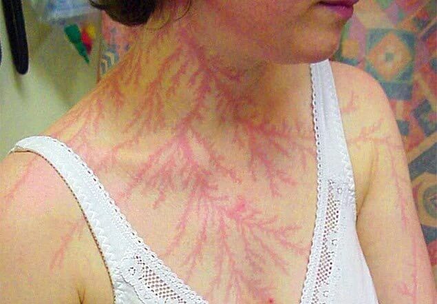 “Yıldırım ağacı” veya “yıldırım çiçeği” olarak bilinen bu karmaşık, eğreltiotu benzeri desenlere kılcal damarların patlaması neden olmaktadır.