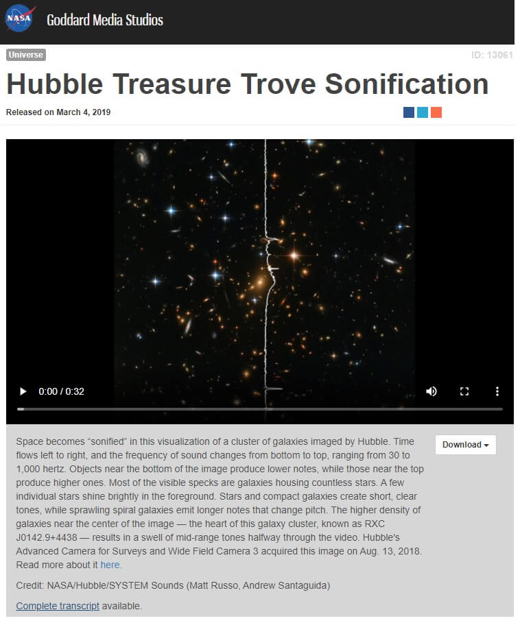 NASA konuyla ilgili yaptığı açıklamada Hubble teleskobunun Wide Field Camera 3 kamerasıyla kaydedilen galaksi kümelerine ait fotoğrafların, her bir öğeye bir ses ataması yapılarak bu kaydın oluşturulduğunu belirtmişti. Kayıttaki farklı tınıların, yıldızlar ve kompakt galaksilere kısa ve net tonlar, sarmal galaksilere de değişen yüksekliğe sahip uzun sesler atanmasıyla oluştuğu aktarılmıştı.