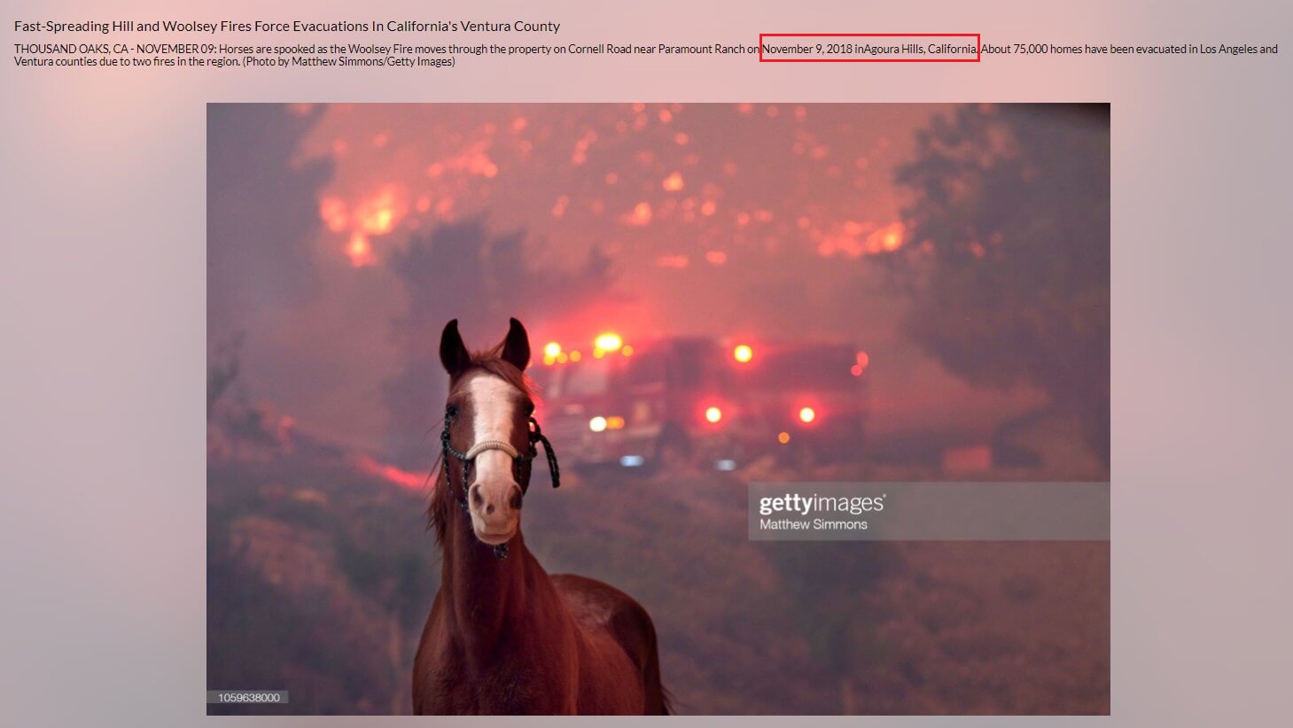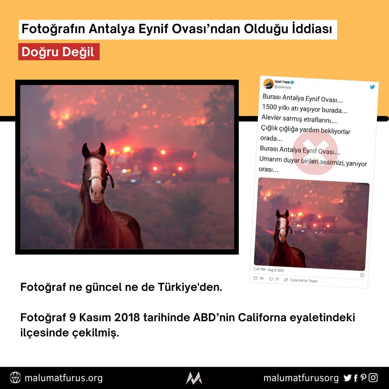 Antalya Eynif Ovası’nda bulunan ve süregelen yangının etkisiyle tehlike altında bulunan yılkı atına ait olduğu iddiasıyla paylaşılan fotoğraf ne Türkiye’den ne güncel. 9 Kasım 2018 tarihinde ABD’nin Californa eyaletindeki ilçesinde çekilmiş.