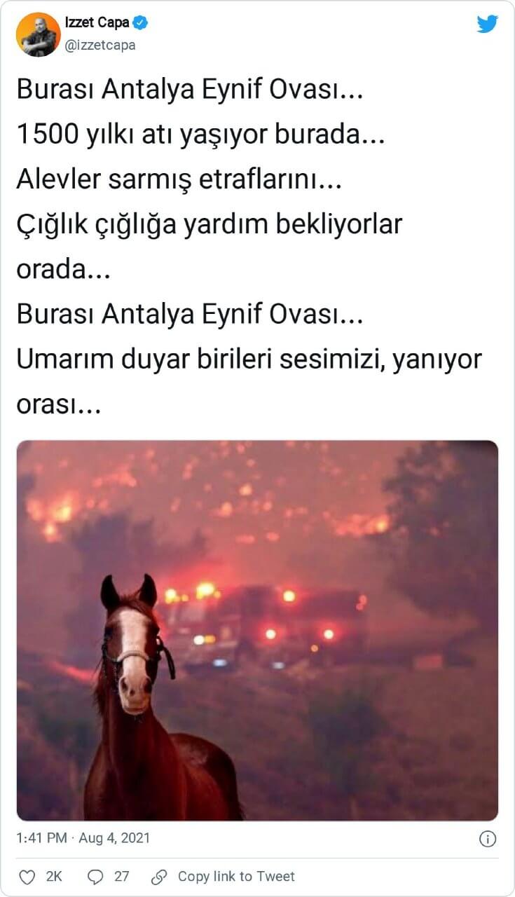 “Burası Antalya Eynif Ovası… 1500 yılkı atı yaşıyor burada… Alevler sarmış etraflarını… Çığlık çığlığa yardım bekliyorlar orada… Burası Antalya Eynif Ovası… Umarım duyar birileri sesimizi, yanıyor orası..”