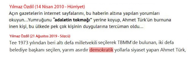 2010 yılındaki yazısında Ahmet Türk’ün yediği yumruk için “pek çok kişinin duygularına tercüman oldu“, “mayın demokrasiyse, yumruk niye faşizm?“, “adaletin tokmağı” yorumlarında bulunan Yılmaz Özdil, 2019 yılında yayınlanan yazısında ise Ahmet Türk’ün yarım yüzyıldır demokratik yollardan siyaset yaptığını belirterek köklü bir görüş değişikliği sergilemiş.