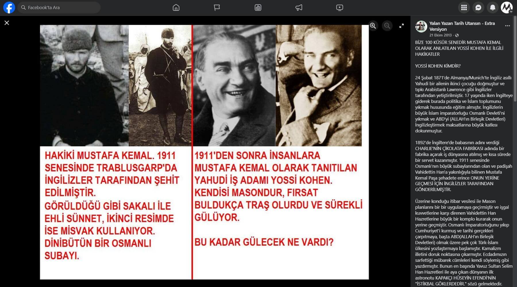 “Mustafa Kemal Atatürk diye bir kişilik dünyaya gelmemiştir. Bize fotoğraflarda, görüntülerde gösterilen şahsiyet, Yahudi bir iş adamı Yossi Kohen’dir. Gerçek Mustafa Kemal, 1911’de Trablusgarp’ta şehit oldu.” uydurması ilk defa 2013 yılında gündeme geldi.