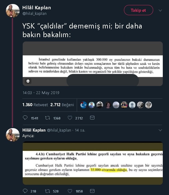 Sabah Gazetesi köşe yazarı Hilal Kaplan YSK’nın gerekçeli kararına dair sosyal medya hesabından yaptığı yorumda “YSK “çaldılar” dememiş mi; bir daha bakın bakalım” diyerek Ak Parti’nin iptal başvurusu dilekçesindeki bölümlerin özetini YSK’nın karar metnine aitmiş gibi paylaşmıştı.