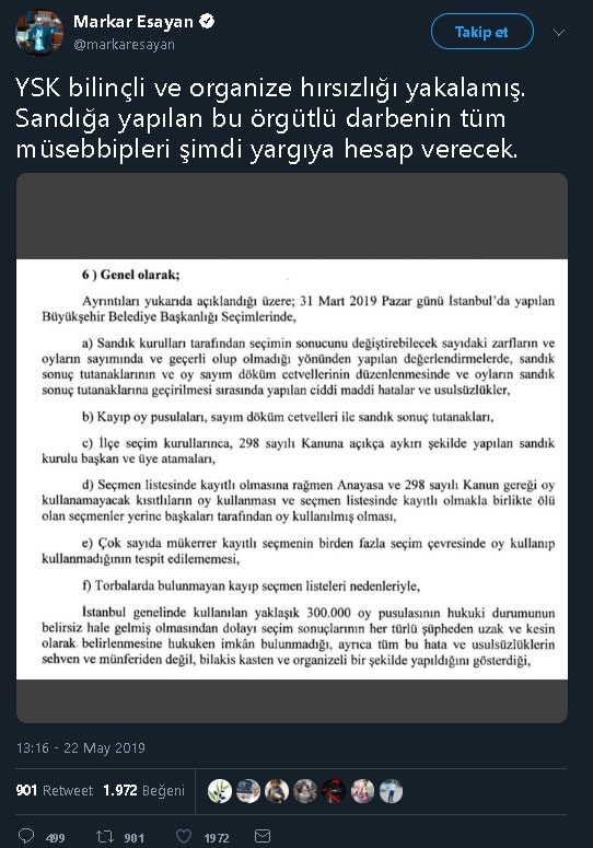 Benzer şekilde Akşam Gazetesi köşe yazarı Markar Esayan da YSK’nın gerekçeli kararına dair “YSK bilinçli ve organize hırsızlığı yakalamış. Sandığa yapılan bu örgütlü darbenin tüm müsebbipleri şimdi yargıya hesap verecek” açıklamasında bulunduğu sosyal medya hesabından yaptığı paylaşımda YSK’nın gerekçeli kararının 11. sayfasında yer alan Ak Parti’nin iptal dilekçesinin özetini YSK kararı olarak paylaşmıştı.