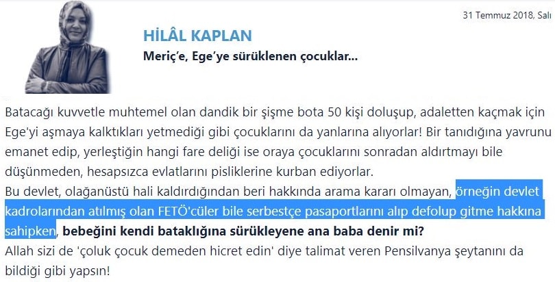 Hilal Kaplan, 31 Temmuz 2018 tarihinde Sabah Gazetesinde “Meriç’e, Ege’ye sürüklenen çocuklar…” başlığıyla yayınlanan yazısında FETÖ soruşturmaları/kovuşturmaları nedeniyle Kanun Hükmünde Kararname (KHK) ile kamu görevinden ihraç edilenlerin olağanüstü halin kaldırılmasından sonra pasaportlarını almasının önünde bir engel olmadığını iddia ederek hatalı bilgi paylaşmış: