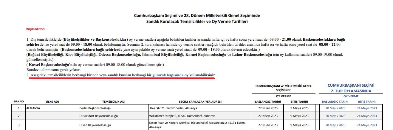Sandık kurulacak dış temsilciliklerde (Büyükelçilikler ve Başkonsolosluklar) oy verme tarih ve saatleri hakkında duyuruda da “temsilciliklerin herhangi birinde veya sandık kurulan herhangi bir gümrük kapısında oy kullanabilirsiniz” notuna yer verilmiş.