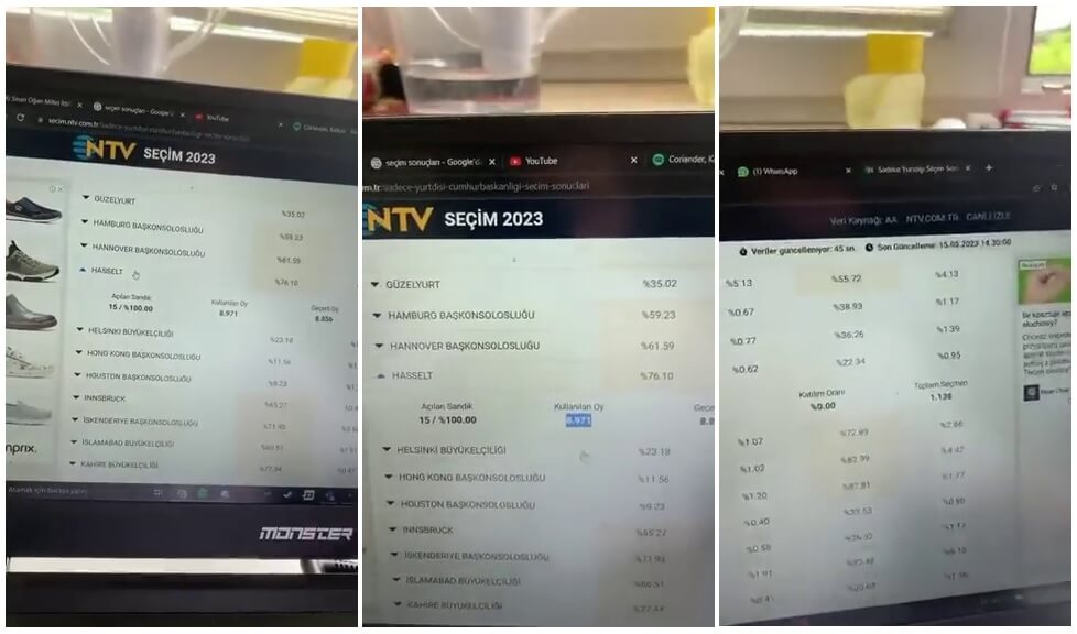 Paylaşılan videoda NTV internet sitesinden yurt dışı seçim sonuçlarının aktarıldığı sayfada bazı yurt dışı temsilciliklerde kurulan sandıklarda kullanılan oy sayısının seçmen sayısından yüksek olduğu görülüyor.