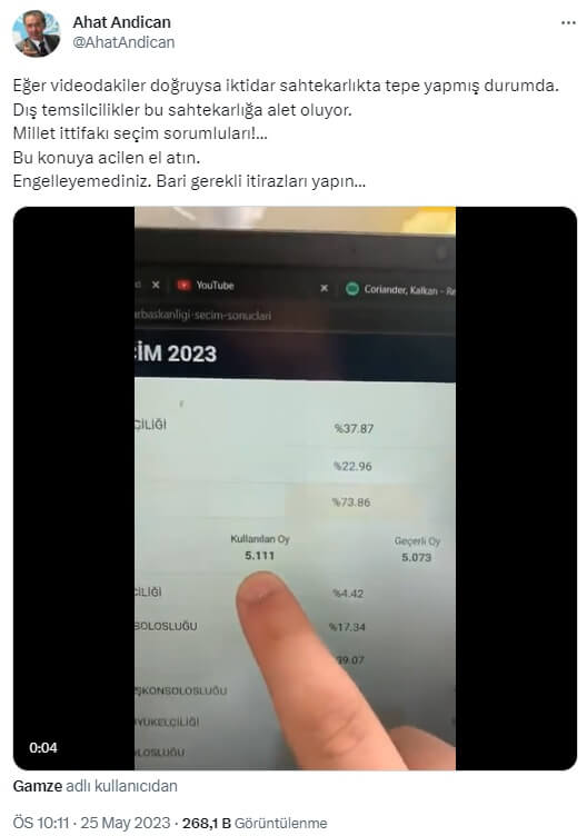 Ahat Andican: “Eğer videodakiler doğruysa iktidar sahtekarlıkta tepe yapmış durumda. Dış temsilcilikler bu sahtekarlığa alet oluyor. Millet ittifakı seçim sorumluları!… Bu konuya acilen el atın. Engelleyemediniz. Bari gerekli itirazları yapın…”