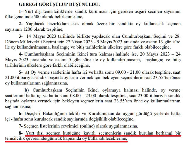14 ve 28 Mayıs 2023 tarihinde düzenlenen seçimlere yönelik yurt dışı temsilciliklerde sandık kurulması için gereken asgari seçmen sayısının ülke genelinde 500 olarak belirlendiği 2023/142 sayılı YSK kararında “yurt dışı seçmen kütüğüne kayıtlı seçmenlerin sandık kurulan herhangi bir temsilcilik çevresinde/gümrük kapısında oy kullanabilecekleri” kararlaştırılmıştı.