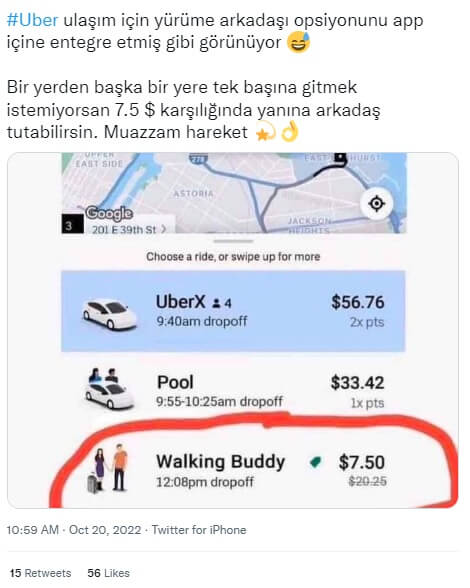 ABD merkezli ulaşım şirketi Uber’in mobil uygulamasında yürüme arkadaşı seçeneğini sunduğu iddiası 2020 yılında gündeme gelmişti.