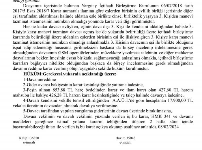 Evlilik birliği içinde gerçekleşen aldatma durumunda üçüncü kişinin tazminat sorumluluğunu düzenleyen Yargıtayca verilen içtihadı birleştirme kararı mahkemelerce istikrarlı şekilde uygulanmaktadır. Eşiyle evli olduğunu bilerek birlikte olan üçüncü şahsa karşı yöneltilen tazminat talepleri reddedilmektedir.