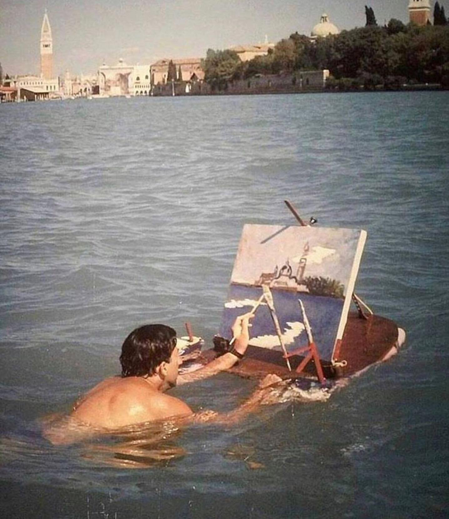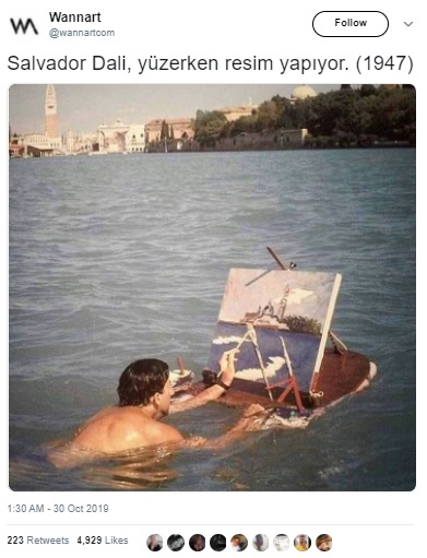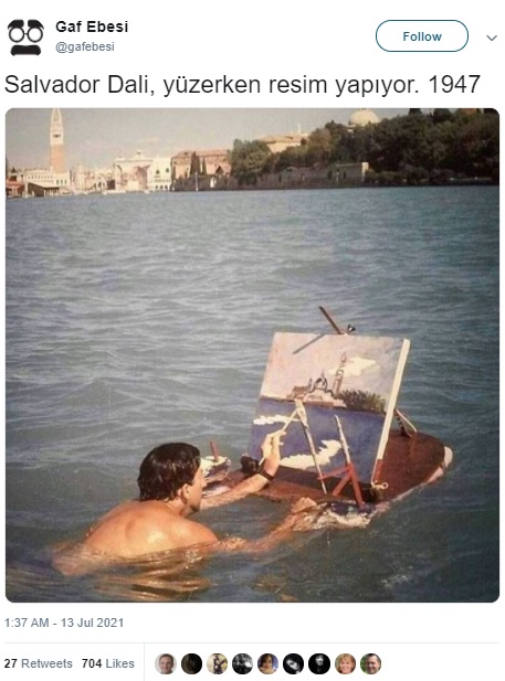 Sosyal medyada Salvador Dali’ye (11 Mayıs 1904 – 23 Ocak 1989) ait sanılarak paylaşılan denizde yüzerken resim yapan kişiye ait fotoğrafı konu edineceğiz.