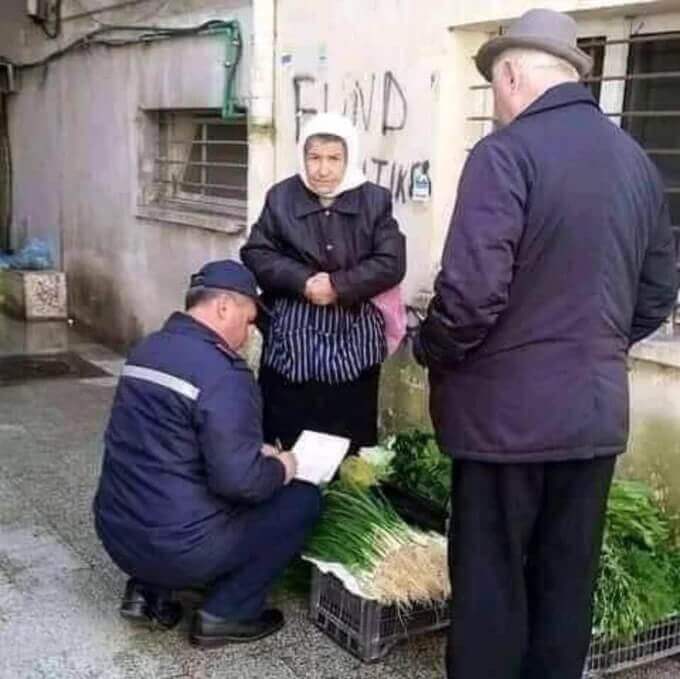 Yaşlı kadına zabıtaların ceza yazdığı görülen fotoğraf Arnavutluk’un başkenti Tiran’da 2016 yılında kaydedilmiş.