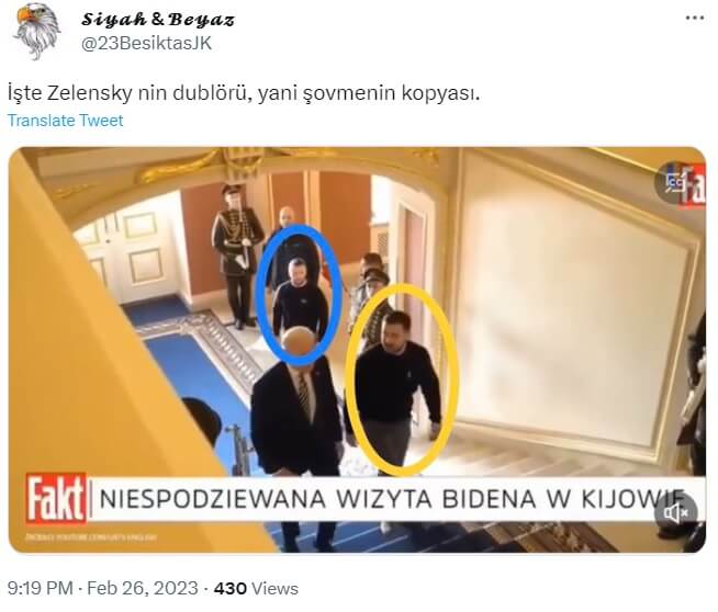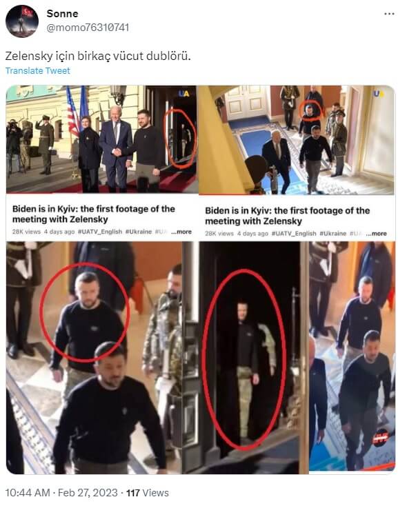 ABD Başkanı Joe Biden’ın Rusya’nın 24 Şubat 2022 tarihinde başlayan işgal harekâtının ardından Ukrayna’yı ilk kez ziyaret ettiği 20 Şubat 2023 günü Ukrayna Devlet Başkanı Volodimir Zelenskiy ile birlikte görüntülendiği karelerde görülen bir kişinin Zelenskiy’in dublörü olduğu sanılmış.