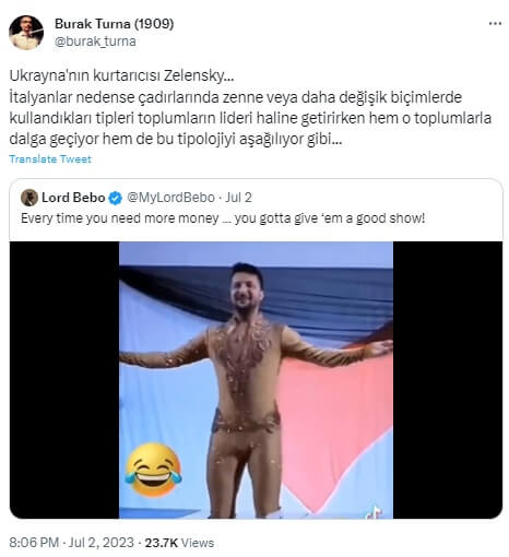 Burak Turna (1909) (@burak_turna): “Ukrayna’nın kurtarıcısı Zelensky… İtalyanlar nedense çadırlarında zenne veya daha değişik biçimlerde kullandıkları tipleri toplumların lideri haline getirirken hem o toplumlarla dalga geçiyor hem de bu tipolojiyi aşağılıyor gibi…”