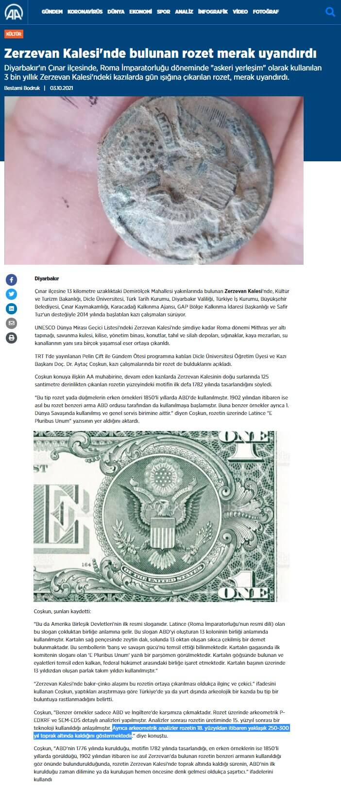 Diyarbakır’daki Zerzevan Kalesi’nde bulunan rozet üzerinde arkeometrik analizlerin rozetin 18. yüzyıldan itibaren yaklaşık 250-300 yıl toprak altında kaldığını işaret ettiği değerlendiriliyor. Bu tarih de ABD’nin kuruluş yılı olan 1776 ile örtüşmektedir.