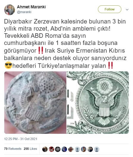 Diyarbakır Zerzevan Kalesi’de Yapılan Arkeolojik Kazıda Bulunan ABD’nin Amblemini İçeren Rozetin 3000 Yıllık Olduğu İddiası Doğru Değil