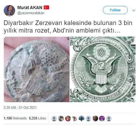 “Diyarbakır Zerzevan kalesinde bulunan 3 bin yıllık mitra rozet, Abd’nin amblemi çıktı! Tevekkeli ABD Roma’da sayın cumhurbaşkanı ile 1 saatten fazla boşuna görüşmüyor‼️Irak Suriye Ermenistan Kıbrıs balkanlara neden destek oluyor sanıyordunız😎hedefleri Türkiye!anlaşmalar yalan‼️”