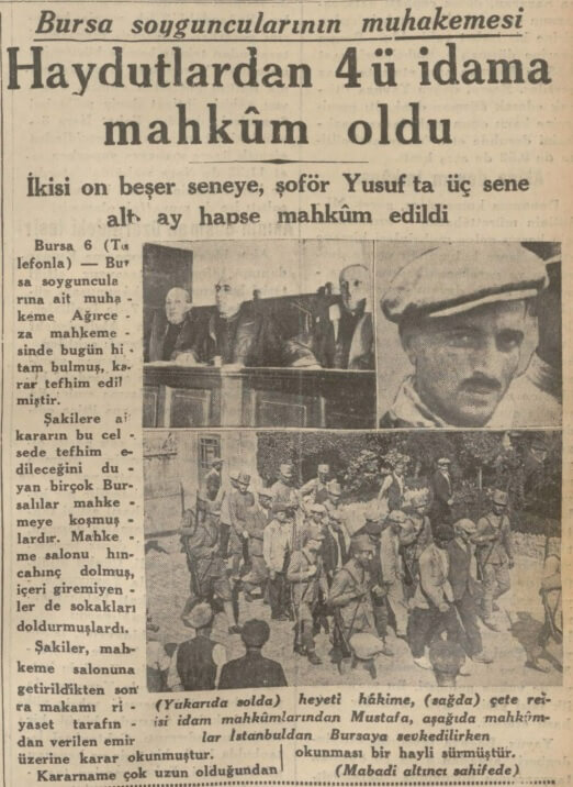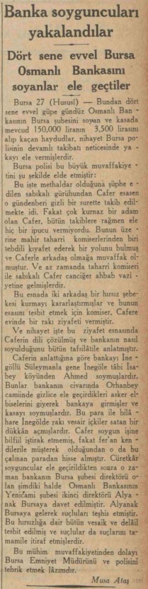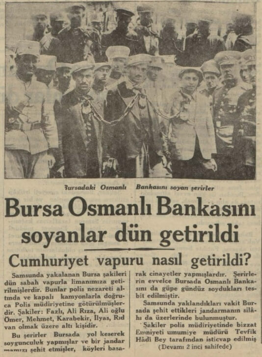 24 Temmuz 1933 tarihli Cumhuriyet’te de “Bu şebekenin Bursa Osmanlı Bankasının soyan çete olduğu da tahakkuk etmiştir” ifadesine yer verilmişti.