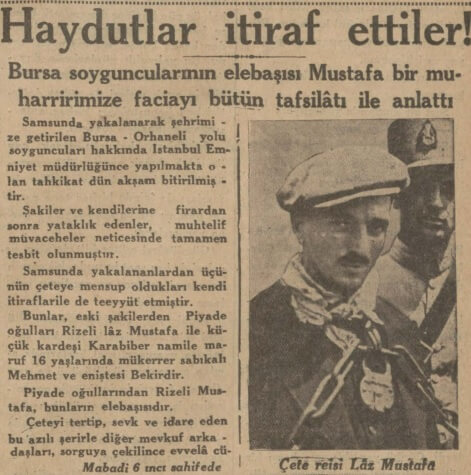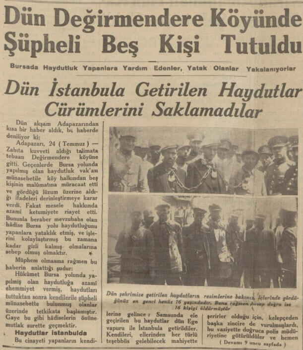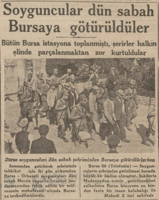 25 Temmuz 1933 tarihli Cumhuriyet gazetesinde Bursa-Orhaneli yolunda gerçekleştirdikleri soygun esnasında cinayet de işleyen suçluların Samsun’da yakalanıp İstanbul’a getirilmeleri şöyle haberleştirilmişti: