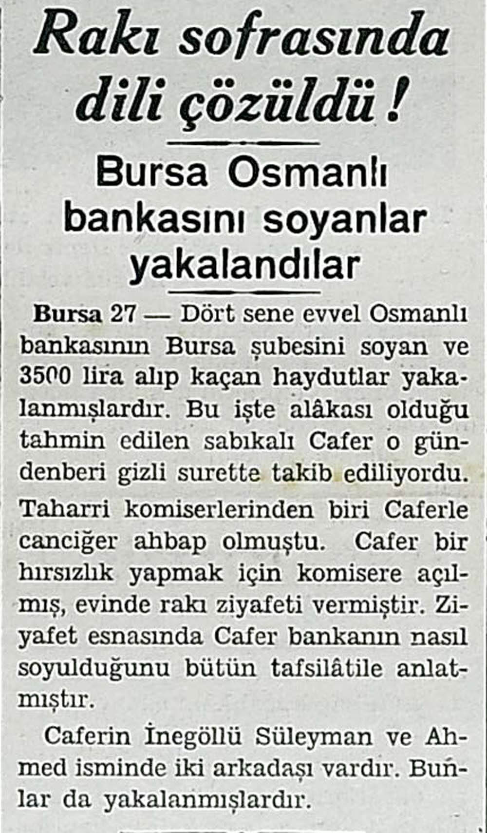 “Türkiye tarihinin ilk soygunu, 89 yıl önce bugün Osmanlı Bankası’nın Bursa şubesinde yaşanmıştı. Asker kılığında iki soyguncu, kasalardan birinde bulunan 3450 lirayı alıp kaçmış; içinde 100 bin lira olan diğer kasa, bir memurun uyanıklık edip “Anahtar Gemlik’e giden bir arkadaşımızın yanında” demesiyle kurtulmuştu. Yalnız Bursa’da değil, tüm Türkiye’de şok yaratan bu “Amerikanvari” soygun günlerce gazeteleri meşgul etmişti. Soyguncular epey bir süre yakalanmamayı başardıktan sonra 10 Ocak 1937’de Bursa’nın İnegöl ilçesinde ele geçirilmişlerdi. İnegöllü Ahmet ve Süleyman adlı iki soyguncuyu olay planlanırken birlikte oldukları ama son anda soyguna katılmaktan vazgeçen arkadaşları ihbar etmişti. 11 Şubat 1937’de başlayan yargılama sonucu iki sanık 28 Haziran 1937’de yedişer sene hapis cezasına çarptırılmışlardı.