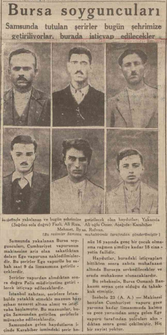 Bu sekiz kişilik soyguncu çetesi, Bursa yolu vak’ asından sonra bir yolunu bulup Samsun. geçmişler, kısa bir müddet sonra orada da Osmanlı Bankasın soymak isterlerken nihayet yakayı ele vermişlerdir. Sıkı bir isticvap ve tahkikat neticesinde soyguncular her iki hadiseyi de en uf ak teferruatına kadar itiraf etmişler ve birkaç gün evvel Cumhuriyet vapurile şehrimize hareket ettirilmişlerdir. Fakat Cumhuriyet vapurunun makinesine anz olan sakatlıktan dolayı, sekiz şerir Ege vapuruna nakledilerek dün sabah saat 9 da şehrimize getirilmişlerdir. Derhal isticvaplanna başlanan soygunculann isimleri şunlardır: Mustafa, Bekir, büyük Mehmet, küçük Mehmet, İlyas, Kazım, Hüseyin ve Osman.”