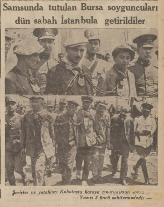 25 Temmuz 1933 tarihli Son Posta’da Orhaneli soyguncularının Kabataş İskelesi’ndeki boyunları zincirli fotoğrafıyla birlikte yakalanma süreçleri şöyle aktarılmıştı: