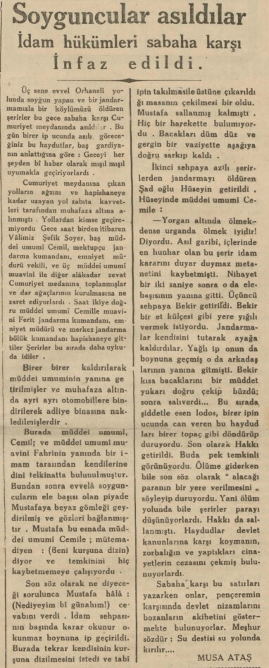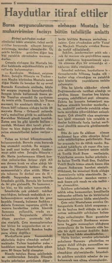26 Temmuz 1933 tarihinde Cumhuriyet gazetesinde, Bursa Orhaneli soygununu gerçekleştiren çetenin liderinin itiraflarına yer verilmişti (Görülebileceği üzere Osmanlı Bankası soygunu ile ilgili bir aktarım yer almıyor):